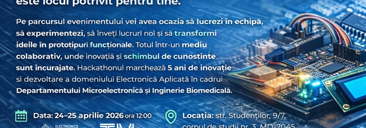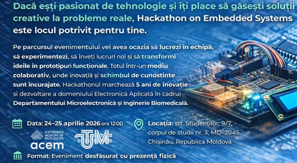 Facultatea de Calculatoare, Informatică și Microelectronică (FCIM), prin Departamentul de Microelectronică și Inginerie Biomedicală, în colaborare cu Asociația Companiilor din Industria Electronică din Moldova (ACEM), invită studenții, inginerii și toți pasionații de tehnologie să participe la Hackathon on Embedded Systems – un eveniment dedicat creativității, inovației și aplicării practice a cunoștințelor în domeniul sistemelor embedded.