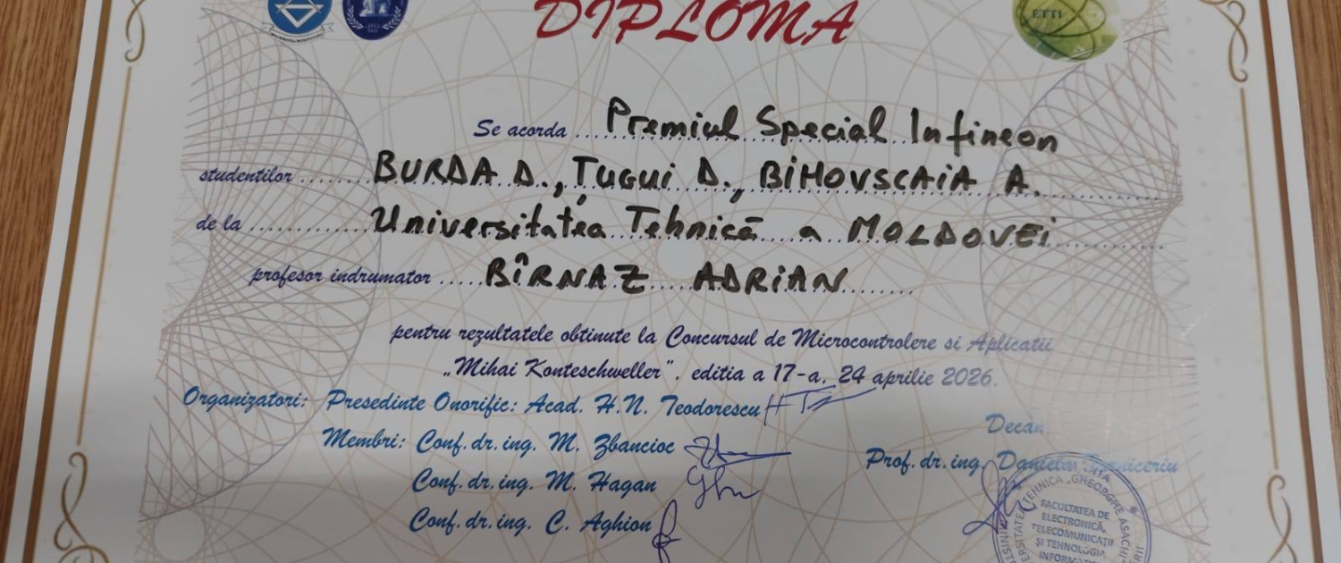 🔹 Premiul Special INFINEON – Burda Dumitru (EA-241), Țugui Delia (IBM-241), Bihovscaia Anastasia (IBM-242), Coordonator: asist. univ. drd. Bîrnaz Adrian