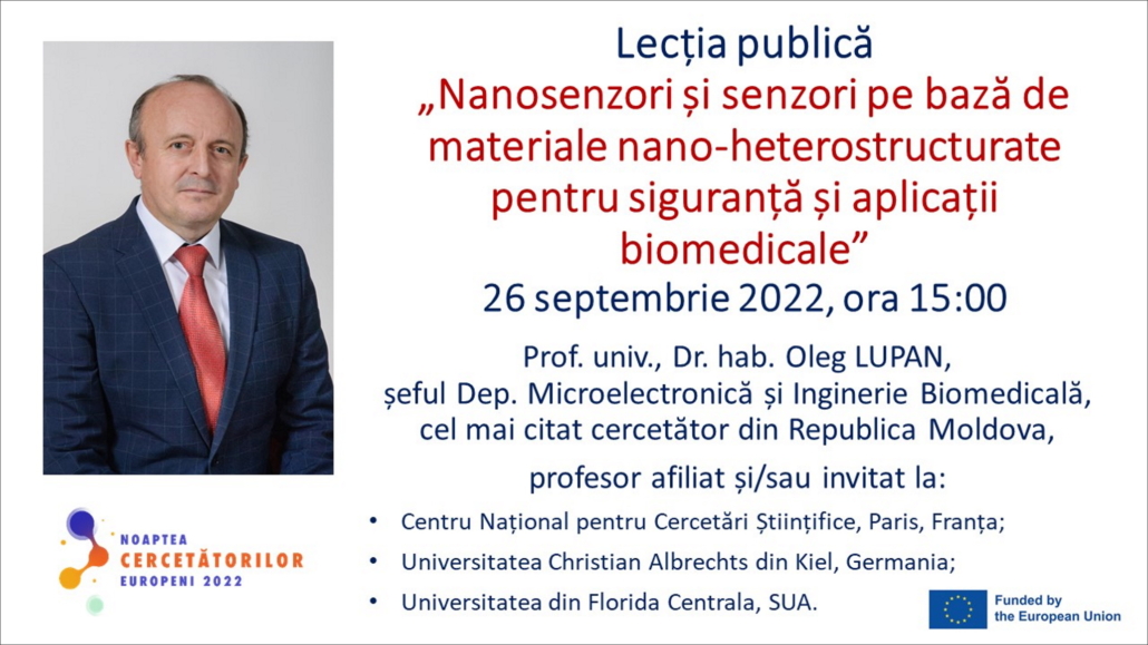 Pe 26 septembrie 2022, ora 15:00, în aula 3-3 Amdaris (str. Studenților 9/7, blocul de studii 3), prof. univ., dr. hab. Oleg LUPAN va ține lecția publică „Nanosenzori și senzori pe bază de materiale nano-heterostructurate pentru siguranță și aplicații biomedicale”, cu transmisiune live, în cadrul căreia va prezenta cercetările realizate și rezultatele obținute cu susținerea financiară a proiectului NATO Science for Peace and Security Programme (SPS), grant G5634 “Advanced Electro-Optical Chemical Sensors” AMOXES.
