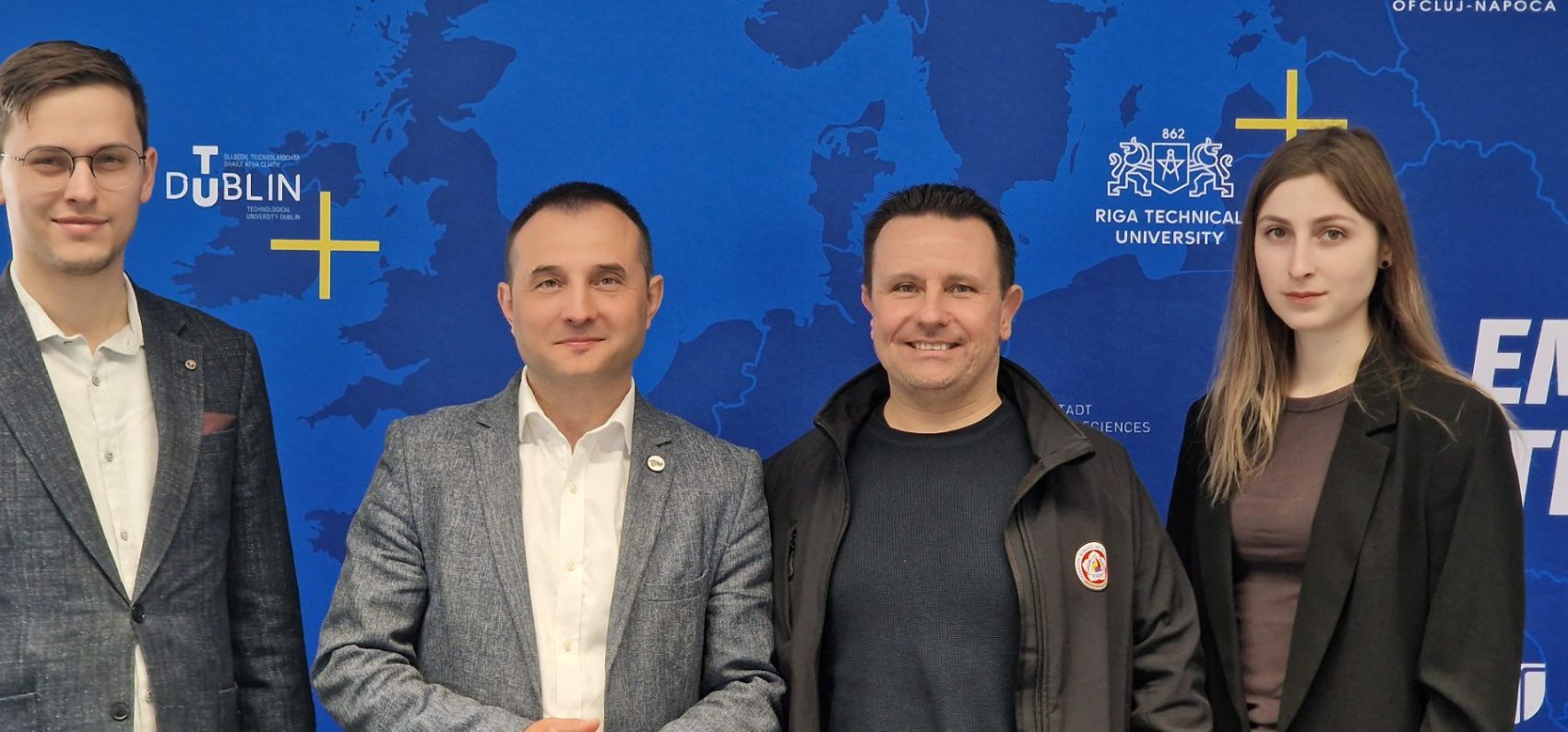 Delegația UTM, condusă de decanul FCIM, conf. univ., dr. Dumitru CIORBĂ, alături de prodecana, lect. univ. Ana ȚURCAN și doctoranzii Adriana URSU și Petru CERVAC, a fost primită cu cordialitate de partenerii de la UTCN. Sub coordonarea prof., dr. ing. Radu Adrian MUNTEANU de la Facultatea Inginerie Electrică, UTCN, cei doi tineri cercetători ai UTM vor beneficia în cadrul proiectului Erasmus+ de sprijin științific și logistic în cercetări de avangardă: Adriana URSU va explora arhitecturi reconfigurabile pentru imagini video în timp real („Reconfigurable computing architectures for real-time video image”), iar Petru CERVAC va cerceta un cadru categorial pentru analiza algoritmilor („Categorical framework for the analysis of algorithms”). Această imersiune într-un mediu academic de excelență, alături de experți consacrați, reprezintă o șansă unică de a-și consolida direcțiile de cercetare și de a aduce o perspectivă nouă în cadrul programelor doctorale ale UTM.